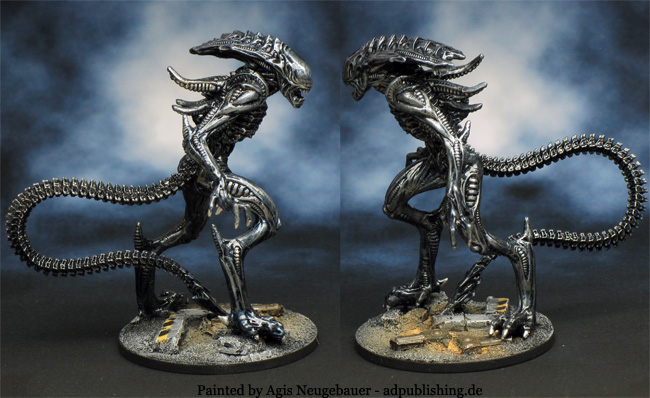The black Aliens are even simpler, black primer, boltgun brushwork, nuln oil wash, very light drybrush in silver, glossy varnish.
