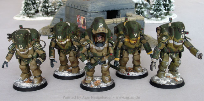 The models are 1/35 scale “Melusine” Panzer Kampf Anzug Ausf M from the Yellow Submarine 1/35 range. These are complete pre painted kits. The head of the Melusine with the opened cockpit is from West Wind Secrets of the 3rd Reich range. I also detailed all kits a bit with the grenade launcher, the camo netting roll on the back, the antenna and the crash bar on the back.