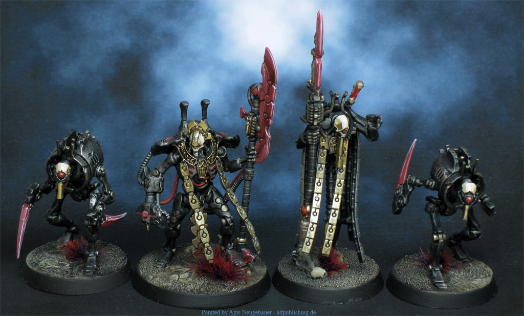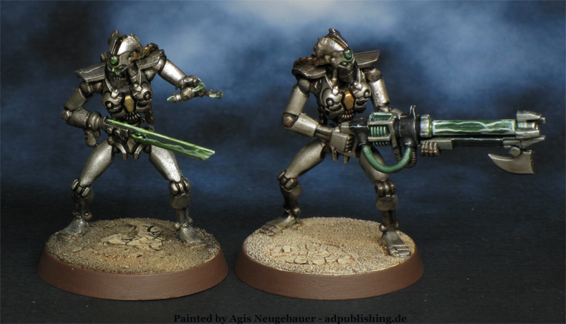 Another side project that might be finished one day. Basically I needed an excuse to order the excellent Wargame Exclusive female Necrocyborg kits. I was not disappointed, as good as expected! The left Necron is a Flayed One stand in made with Ad Mech Ruststalker parts since I always found the Flayed One minis incredible stupid (in a funny but not horrible way).