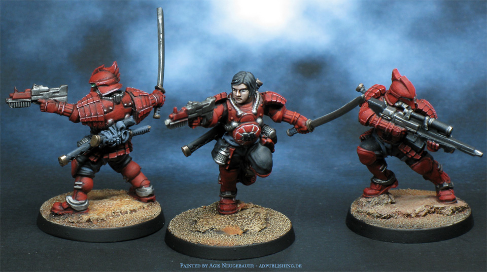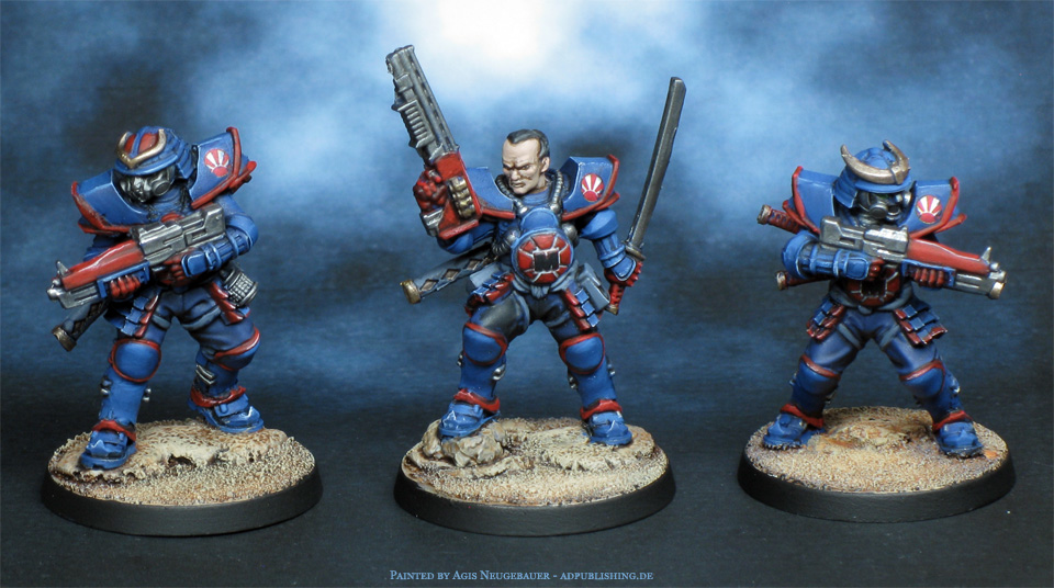 The always asked for scale comparison: Warzone 2nd edition plastic Trencher, Prodos Capitol trooper, Mödiphius Legionnaire and the new Warzone Eternal Hatamoto.
