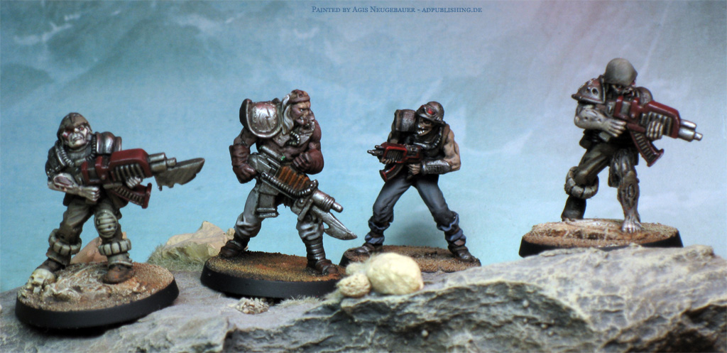 The always asked for scale comparison: Warzone 2nd edition plastic Trencher, Prodos Capitol trooper, Mödiphius Legionnaire and the new Warzone Eternal Hatamoto.