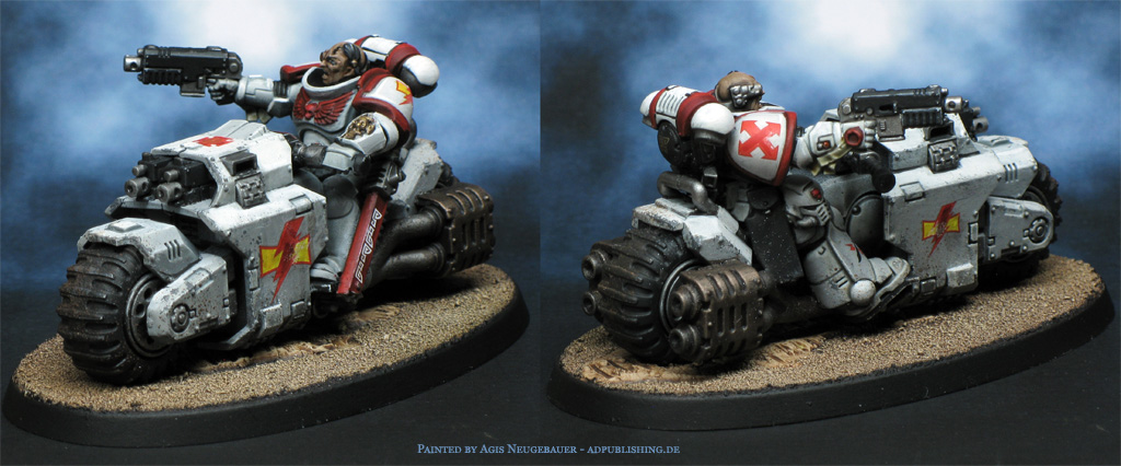 These three Outriders ride as the forward hunters of Kharak’s Swift Talons, ranging ahead of the Impulsor Iron Gale to harry, isolate and break the enemy before the main assault strikes home. Armed with heavy bolt pistols and Astartes chainswords, they soften the foe in a storm of close-range fire before crashing into weakened lines with whirring blades and roaring engines.